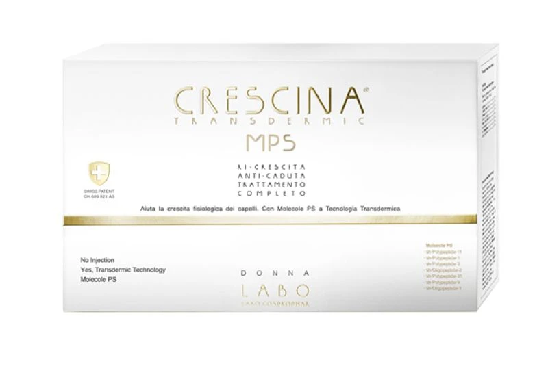 CRESCINA TRANSDERMIC RI-CRESCITA MPS (fiale ambra) è un trattamento ad uso topico di impiego cosmetico per la crescita fisiologica dei capelli con Tecnologia Transdermica che favorisce la penetrazione degli attivi – coadiuvati da 3 enhancer – sia attraverso gli osti follicolari che attraverso tutta la superficie del cuoio capelluto. La presenza di 7 Molecole PS (sh-Polypeptide-11, sh-Polypeptide-1, sh-Polypeptide-3, sh-Oligopeptide-2, sh-Polypeptide-31, sh-Polypeptide-9, sh-Oligopeptide-1) identiche alle molecole peptidiche endogene presenti naturalmente nel sistema pilifero, stimola profondamente la crescita del capello. Ulteriori attivi presenti: complesso Ri-Crescita, complesso HFSC, 3 enhancer. Per cuoio capelluto diradato.