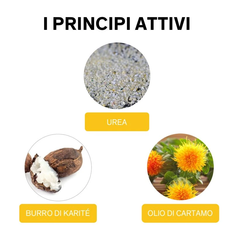 Urea anti-secchezza: l’urea è uno dei costituenti del film idro-lipidico protettivo della superficie epidermica e rientra nella composizione degli NMF (fattori naturali di idratazione) cutanei, la cui funzione è mantenere un tasso ottimale di idratazione negli strati superiori e ripristinare l’integrità strutturale della pelle.